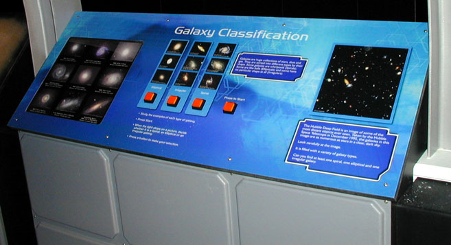 With this GameWorks Galaxy Classification Interactive the visitor is challenged to match randomly selected galaxy images to one of three sets of examples. Exhibits by Exhibitworks Inc.