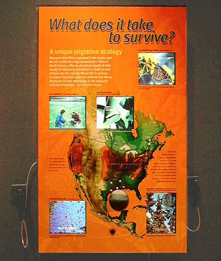 This exhibit depicts the migration of the Monarch butterfly from Mexico through North America and back to Mexico. The presentation uses a 90 second audio narration with 5 back lit photos and dozens of LEDs to show the migration of the Monarchs.
